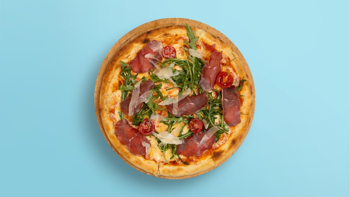 Rukolla, proshutë, domatina, kaçkavall, parmazan dhe rigon