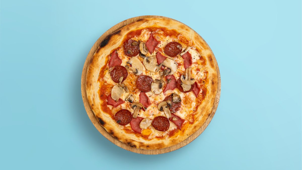 Pica jonë speciale me proshutë, suxhuk, sos domatesh, kërpudha, kaçkavall dhe rigon