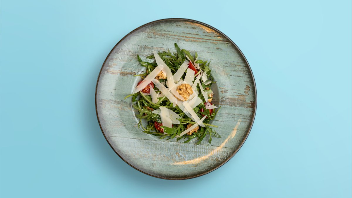 Rukola e freskët, domatina të vogla, arra, parmezan dhe bazilik