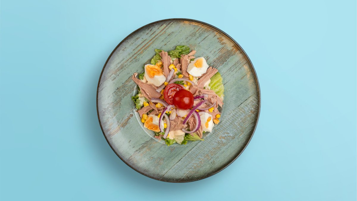 Marullë, qepë, vezë të ziera, misër, domatina, tuna dhe ice berg