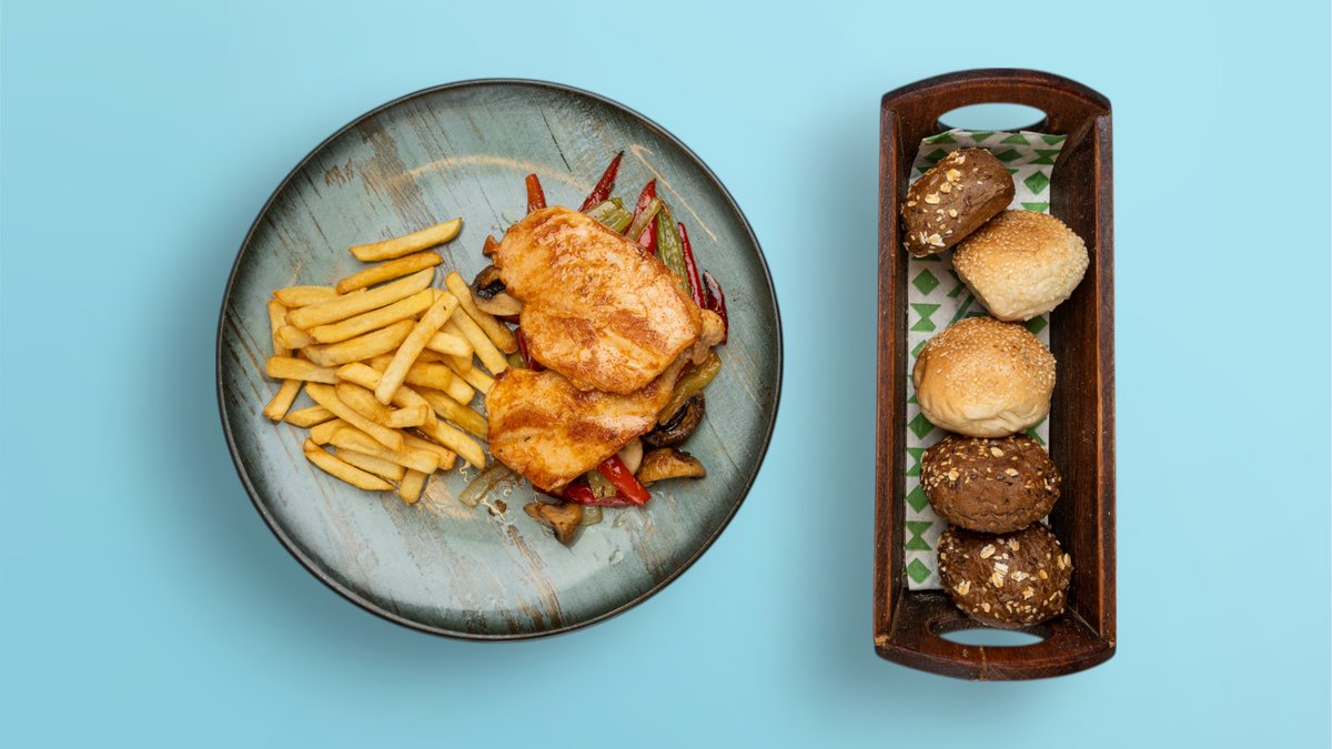 Fileto pule e pjekur në skarë, i shoqëruar me speca qepë, kërpudha të fërguara dhe pomfrit