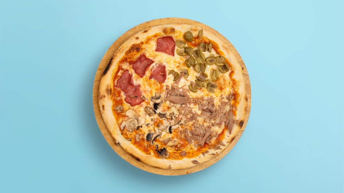 Proshutë, tuna, kërpudha dhe ullinj, mbi bazë të sosit të domates dhe kaçkavallit.