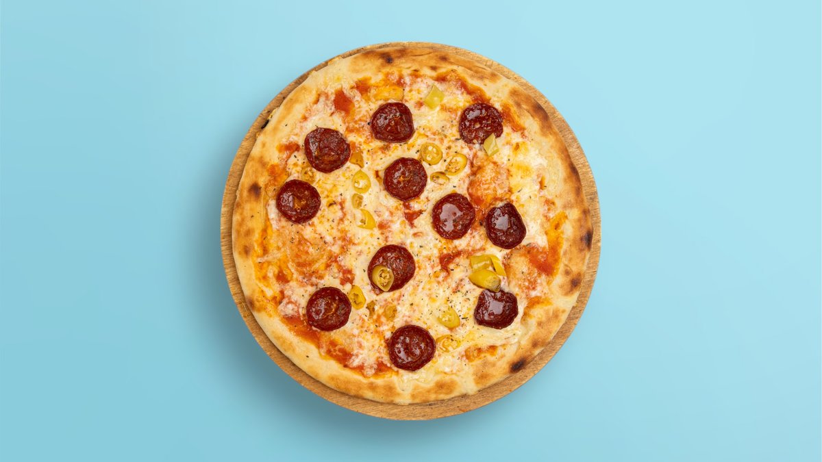 Pica pikante me suxhuk të shijshëm, kaçkavall, feferona dhe sos domatesh, e aromatizuar me rigon