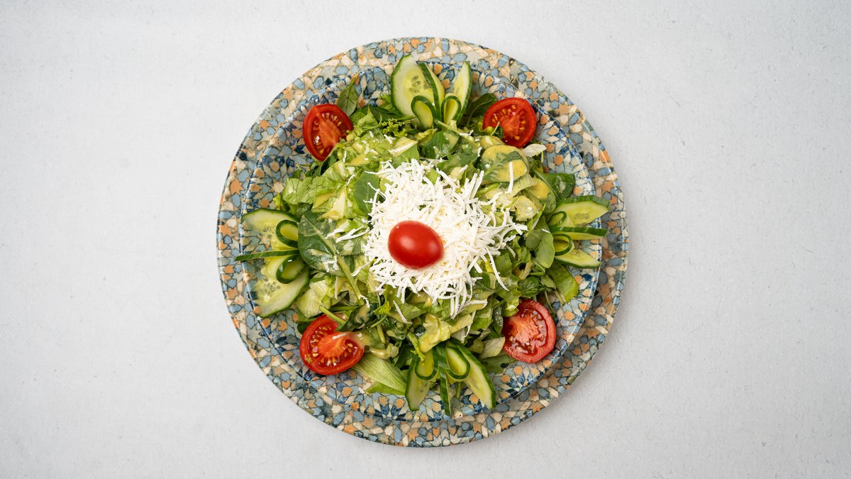 Sallatë e gjelbër, tranguj, domate, qepë, ullinjë, misër