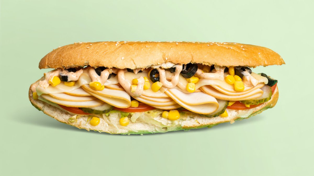 Pulë krokante, domate, majonezë, kastraveca turshi, misër, sallatë e gjelbërt