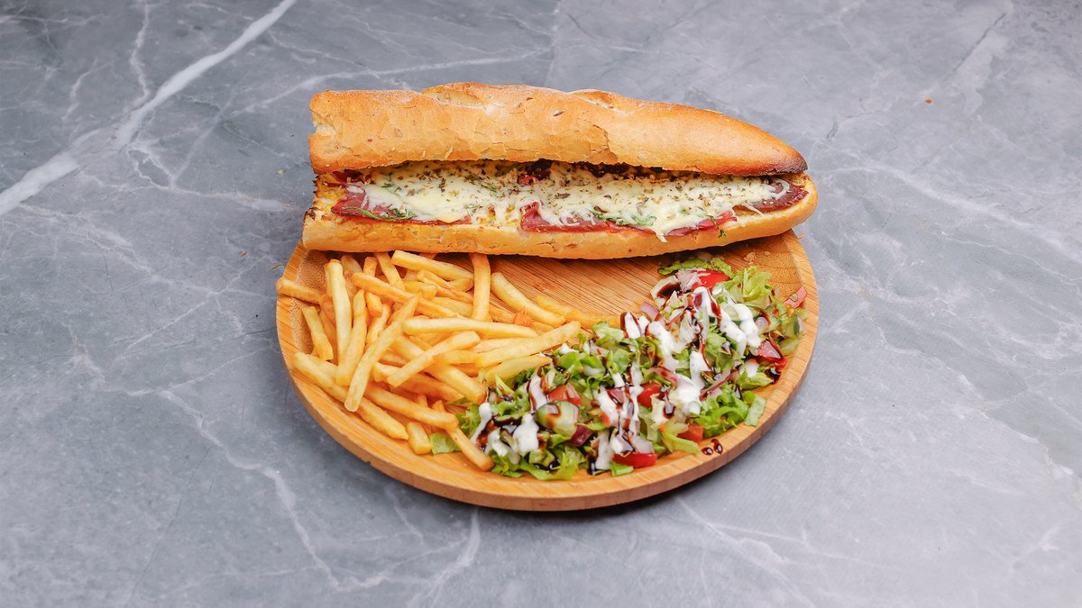 Sos senf, proshutë e tymosur, kaçkavall, domate, rukola, shoqërohen me garniturë & pomfrit