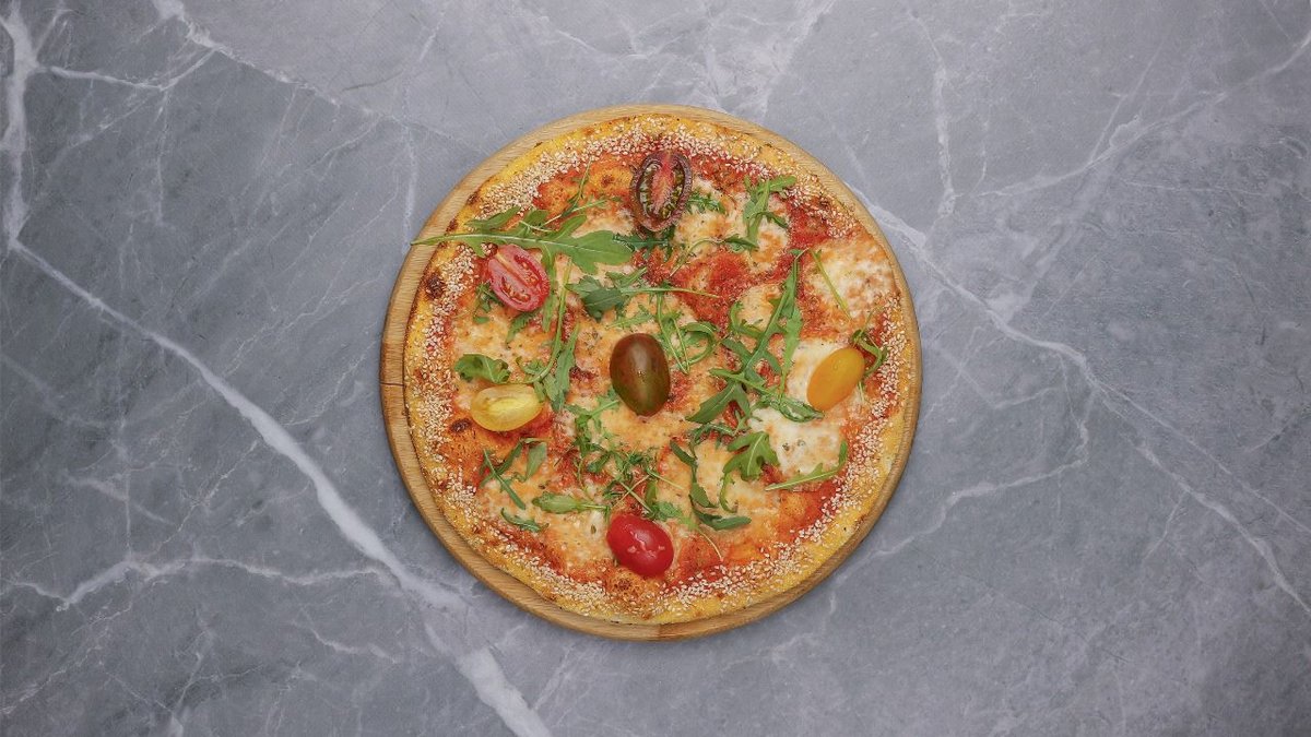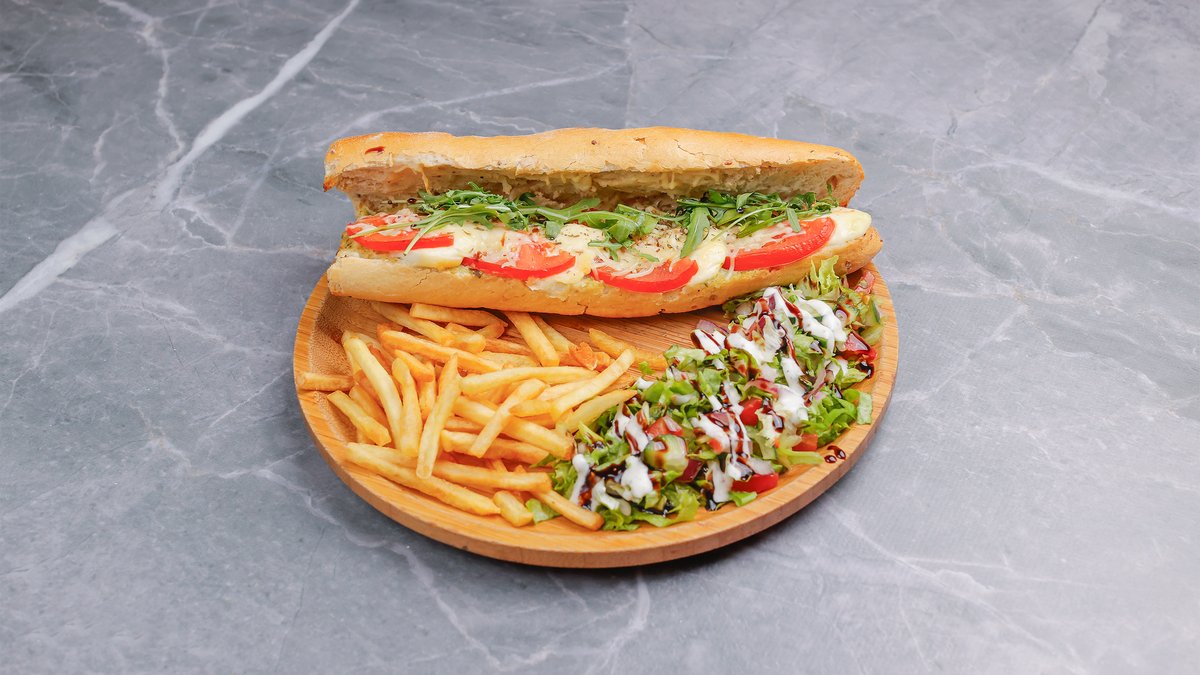 Sos domate, mozzarella, pesto, domate, rukola, shoqërohen me garniturë & pomfrit