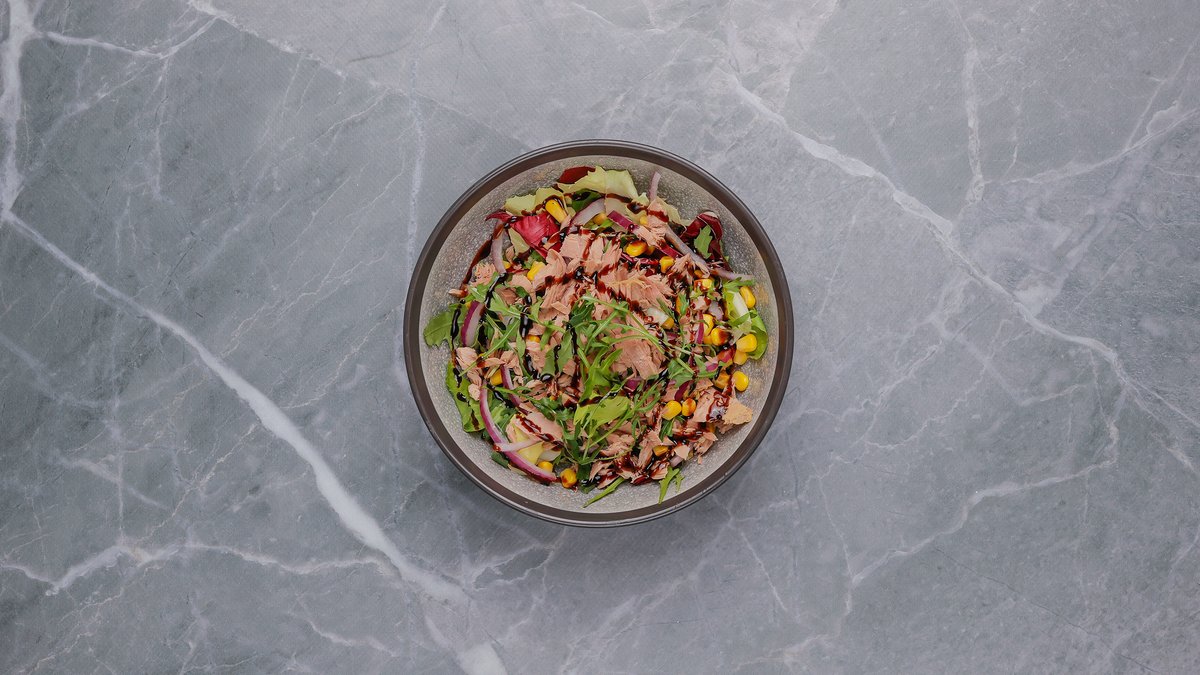 Sallatë jeshile, tuna, misër i zier, qepë e kuqe, balsamic