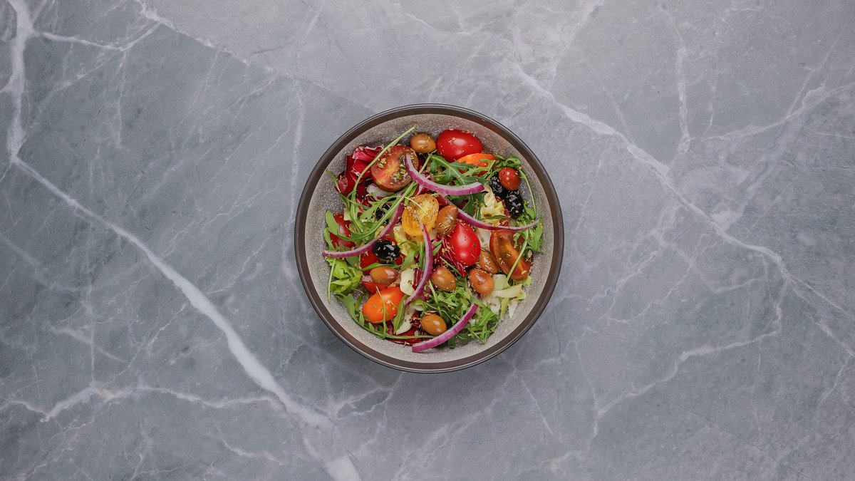 Sallatë jeshile, rukola, pomodorini, qepë e kuqe, ullinj