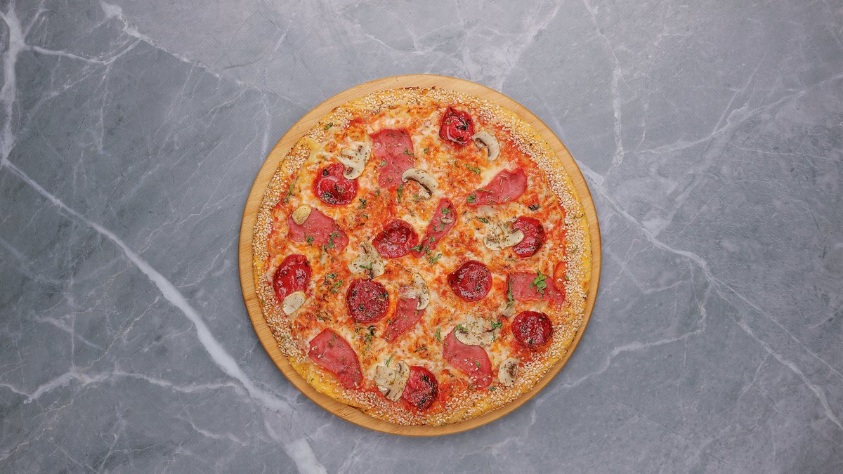 Sos domate, kërpudha, spec i kuq, spec jeshil, qepë e kuqe, domate, misër, kaçkavall, shoqërohen me garniturë & pomfrit