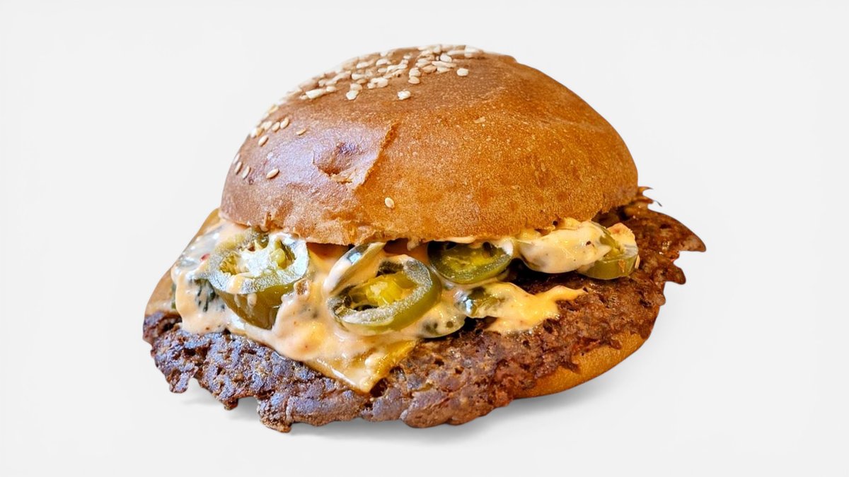 Homemade bun, 120g ground beef, cheddar, jalapenos, pickles, Hotty sauce