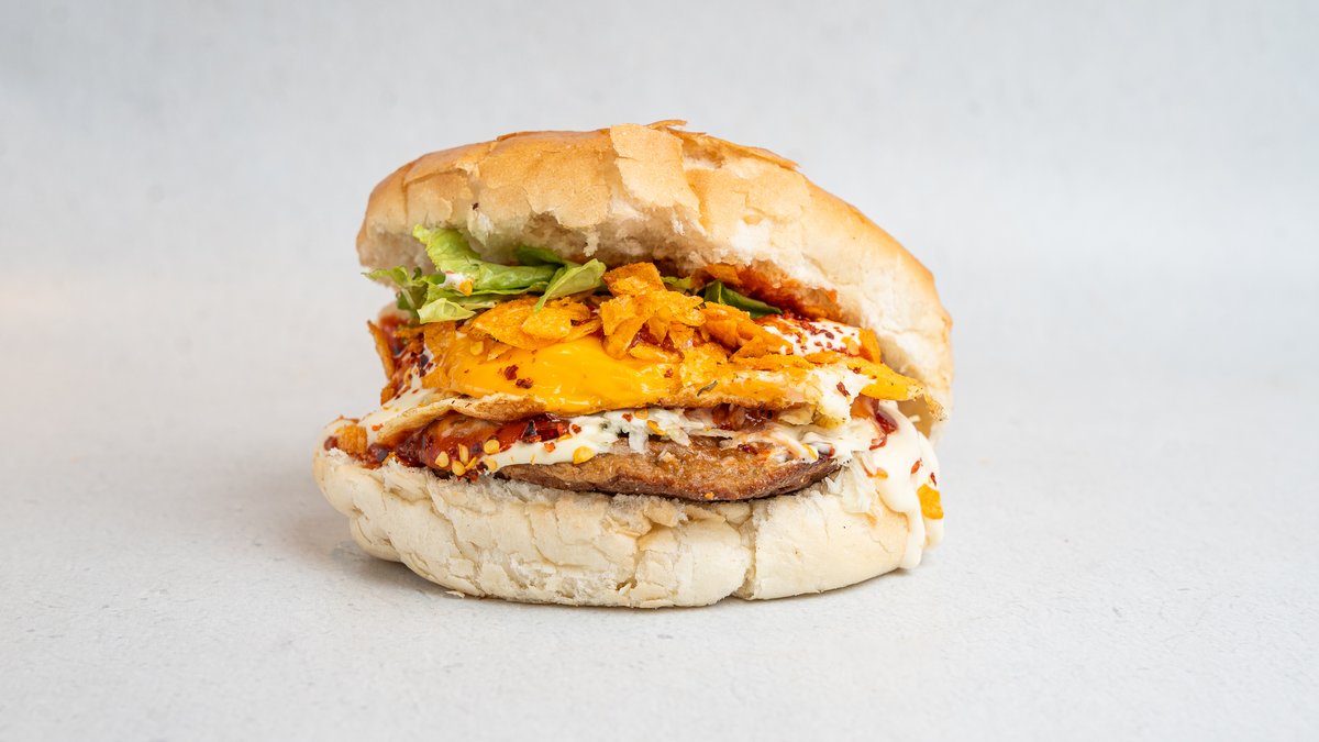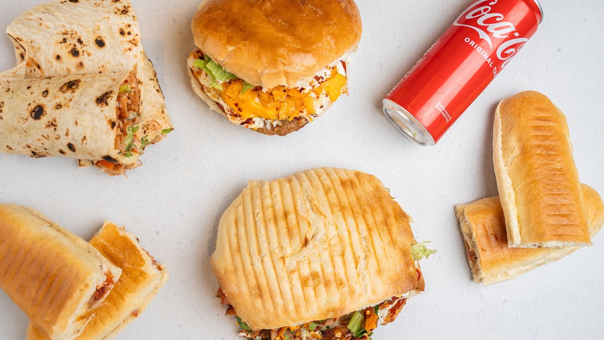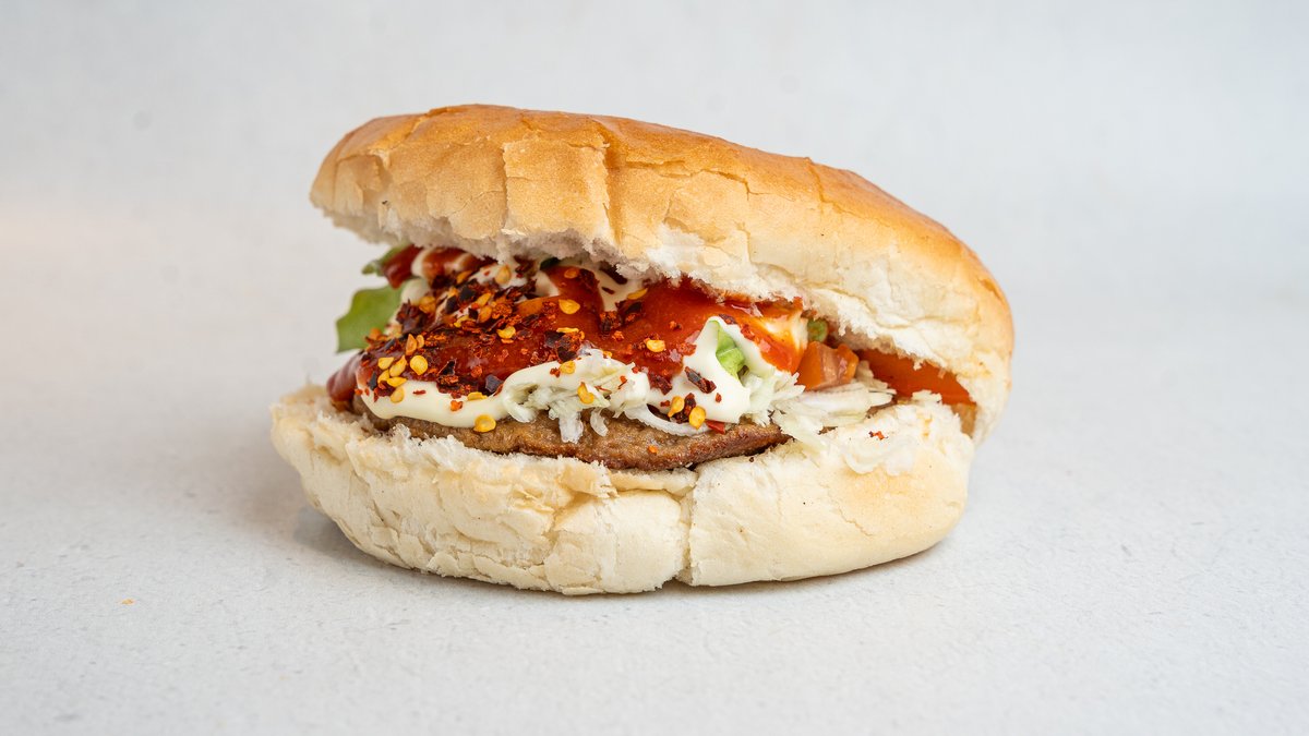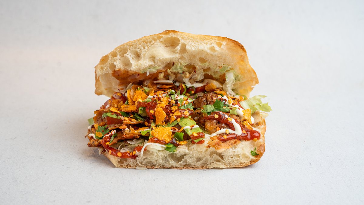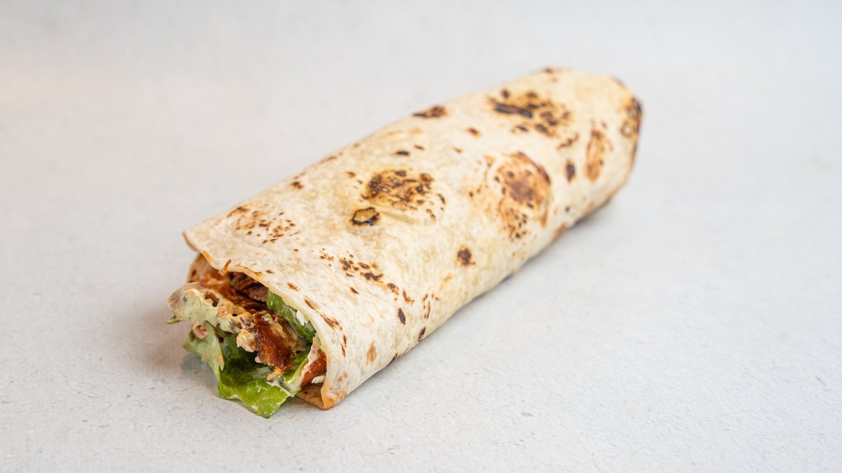 Doner pule në bukë, slacë caesar, sallatë, domate, qepë