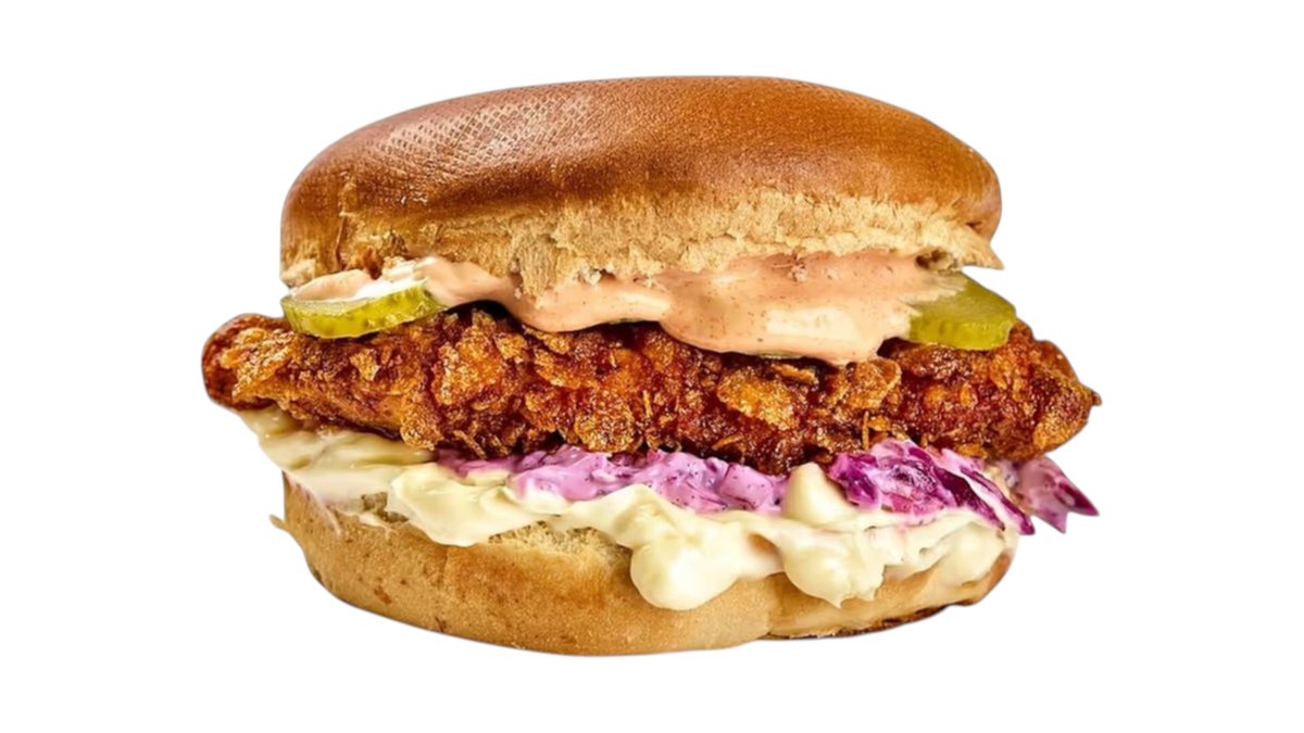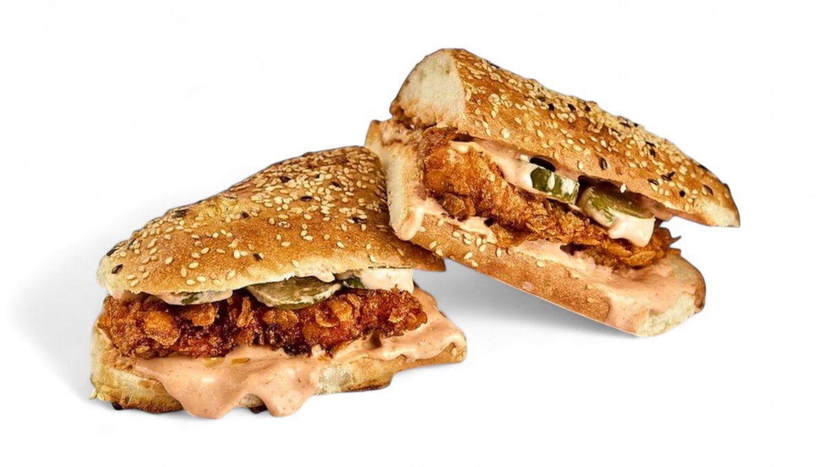 Fileto pule krokante dhe e artë, e shtresuar me salcën tonë pikante të përgatitur në shtëpi, majonezë të butë me trumëz dhe sallatë kremoze me lakër dhe karrota. E përfunduar me turshi dhe një bukë të butë. Shërbehet me qips të kriposur.