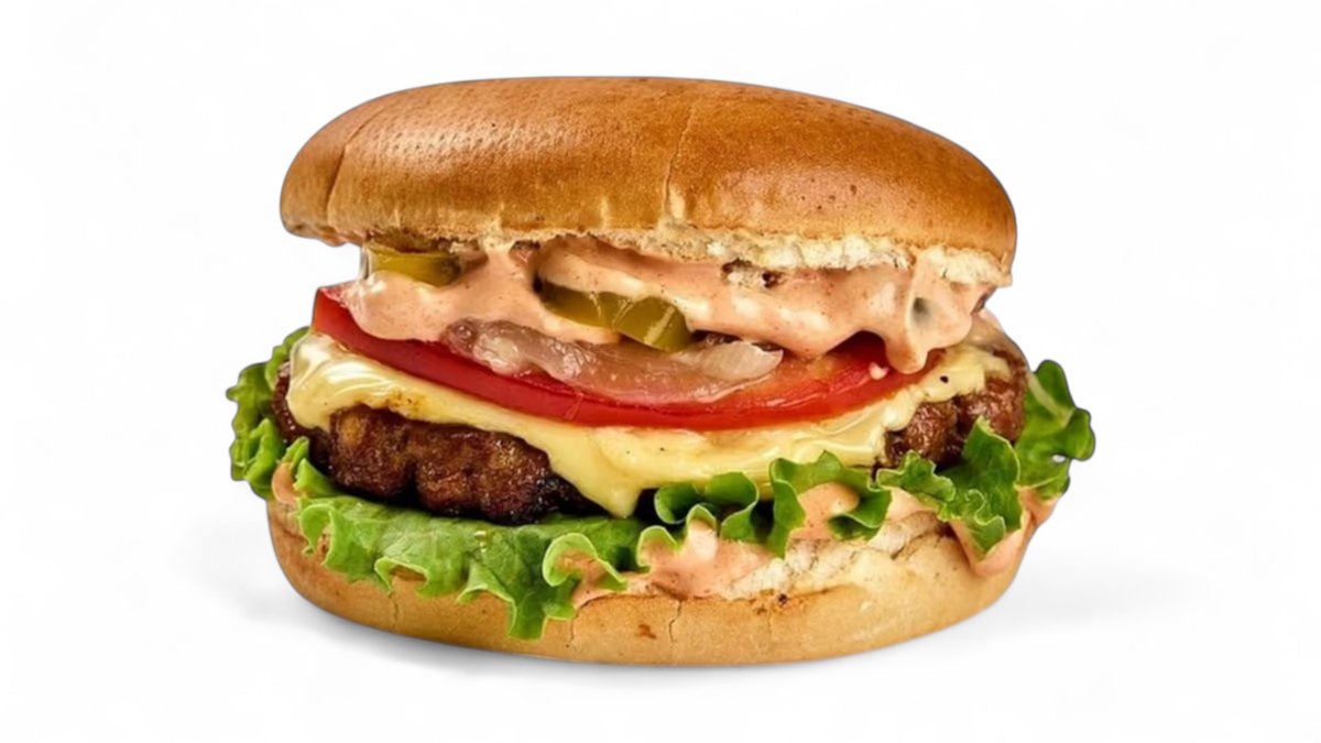 Një pleskavicë e përgatitur me dorë me 150g mish viçi, me djathë të shkrirë sipër, qepë të karamelizuara, sallatë të grirë, domate dhe speca jalapeno. E bashkuar në mënyrë perfekte me salcën tonë të veçantë për hamburger dhe një bukë të butë. Shërbehet me patate të skuqura të erëzuara me kripë dhe rigon.