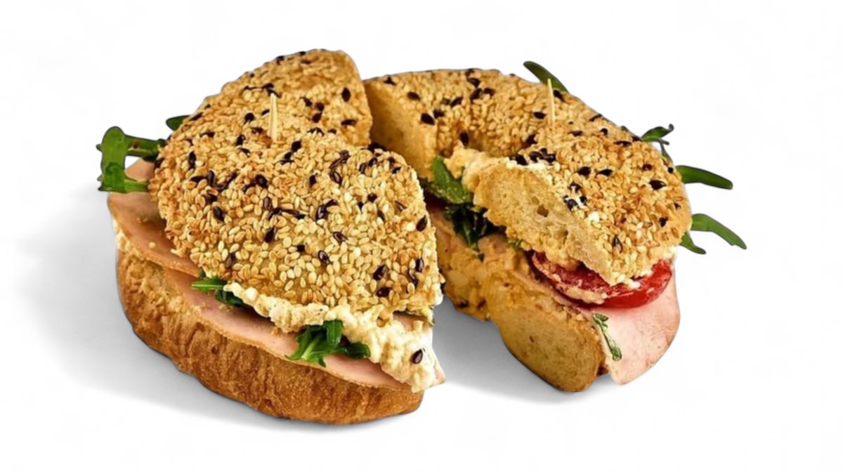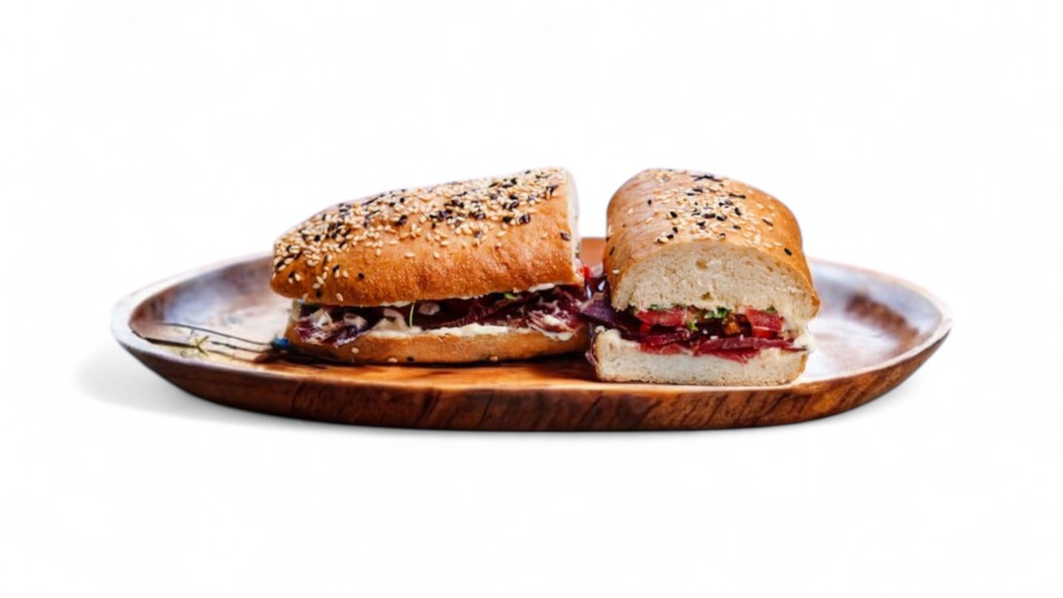 Proshutë, bukë sanduiçi e shtëpisë, salcë speciale shtëpie, domate, rukola, speca të kuq