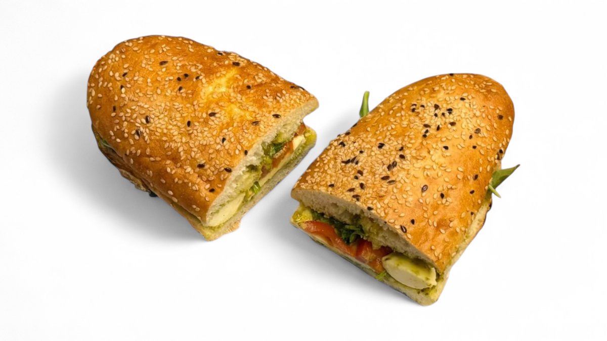 Bukë sanduiçi e shtëpisë, pesto, domatina, mocarela, rukola, vaj ulliri, salcë balsamike