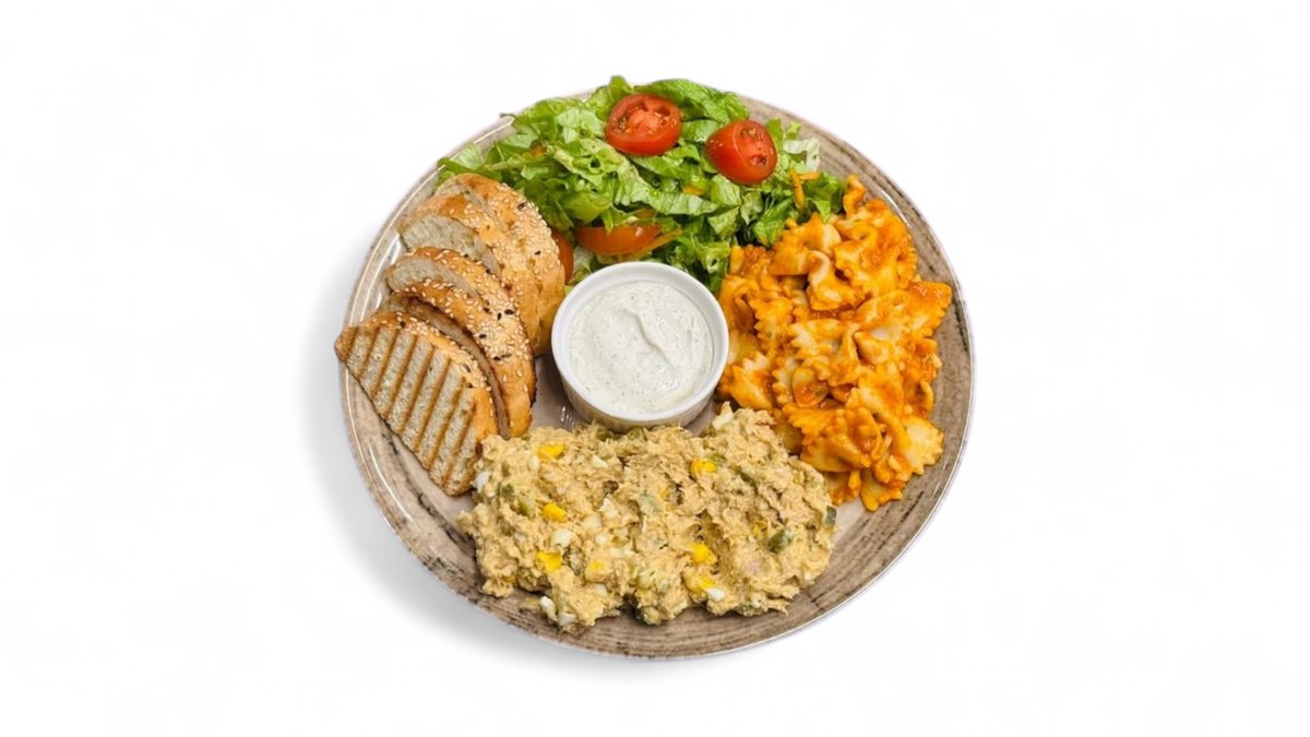 Tuna, sallatë shtëpie, makarona të ftohta, salcë shtëpie, bukë e shtëpisë