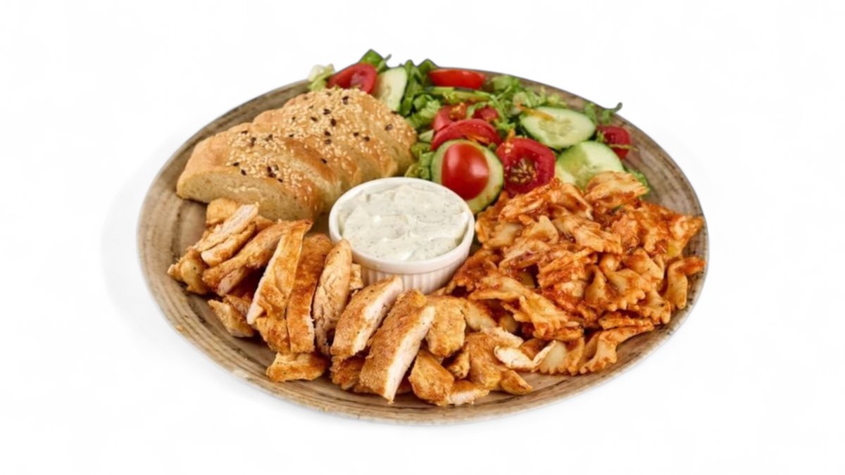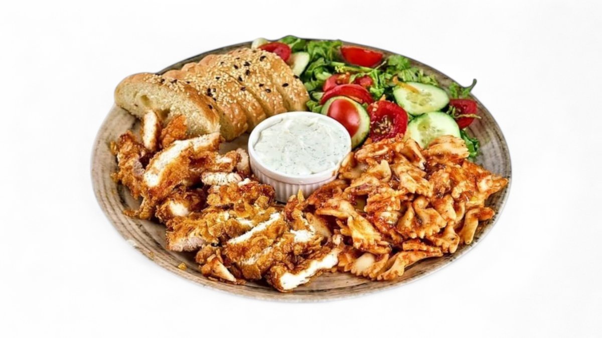 Fileto pule krokante, sallatë shtëpie, makarona të ftohta, salcë speciale, bukë e shtëpisë