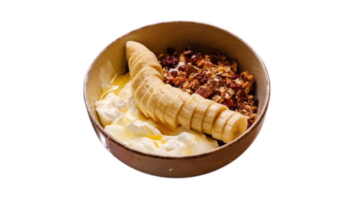 Granola të shtëpisë me arra, bajame, rrush të thatë, tërshërë dhe brusnicë, kos grek, banane, mjaltë
