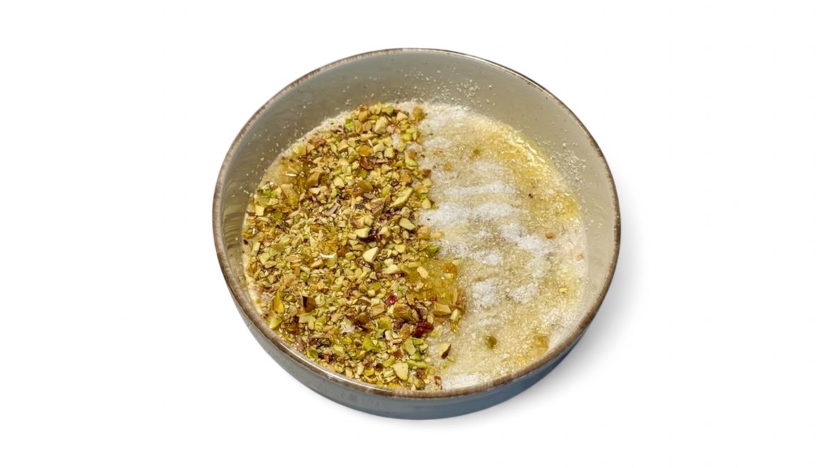 Tërshërë e zier me qumësht, fara chia, kokos, fëstëk, mjaltë