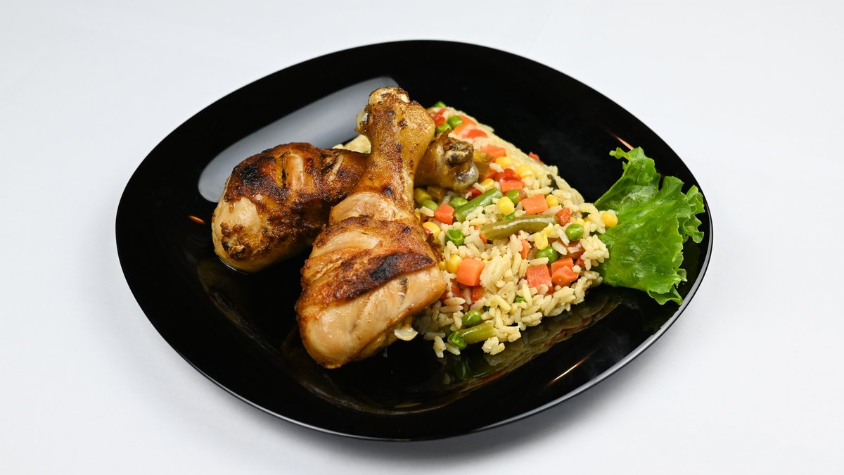 Pulë amerikane, oriz, sos, sallatë, mantia