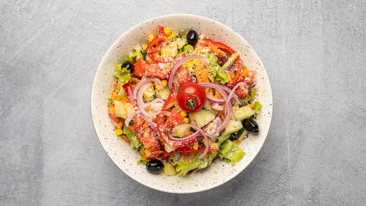 Sallatë e gjelbër, domate, tranguj, qepë, speca, karrotë, qepë e kuqe