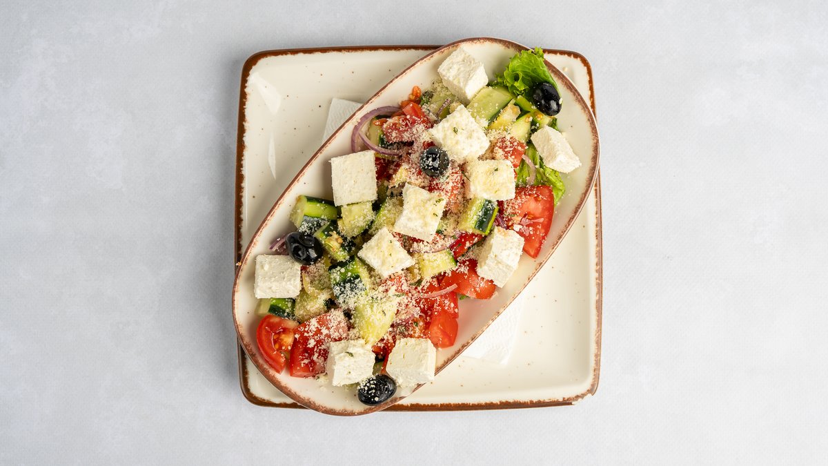 Domate, tranguj, qepë, speca, ullinjë, djathë katror