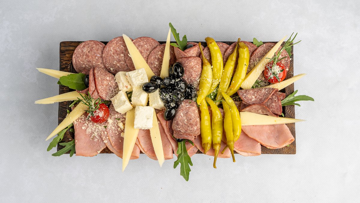 Proshutë, djathra të ndryshme, suxhuk shtëpie, sallatë, domate, tranguj, ullinj