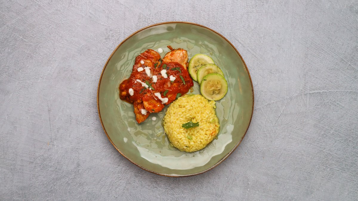 Oriz arborio i gatuar në mënyrë perfekte me copa pule të buta të skuqura. E përfunduar me djathë parmigiano dhe erëza të freskëta për një pjatë të pasur dhe me shije