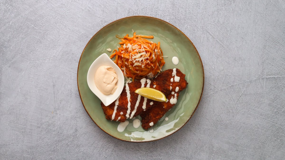 Pulë e skuqur deri në ngjyrë të artë. Shërbyer me pasta, parmesan dhe një sperkatje limoni