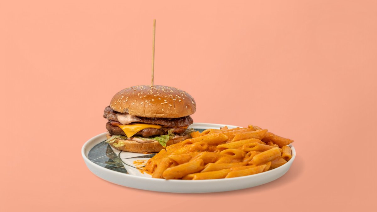 Hamburger me Pasta & Coca Cola & Ujë & Hurmë