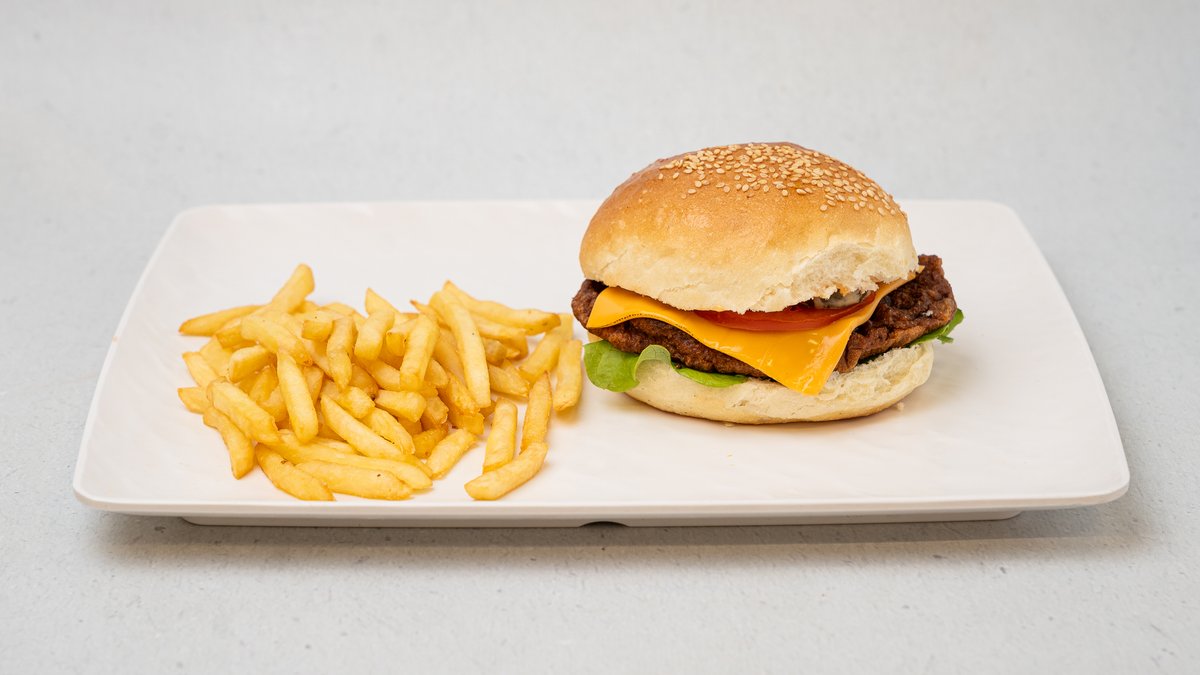 Mish i bluar, sos, sallatë e gjelbër, domate, feta kaçkavalli, pomfrit, kërpudha, qepë të fërguara