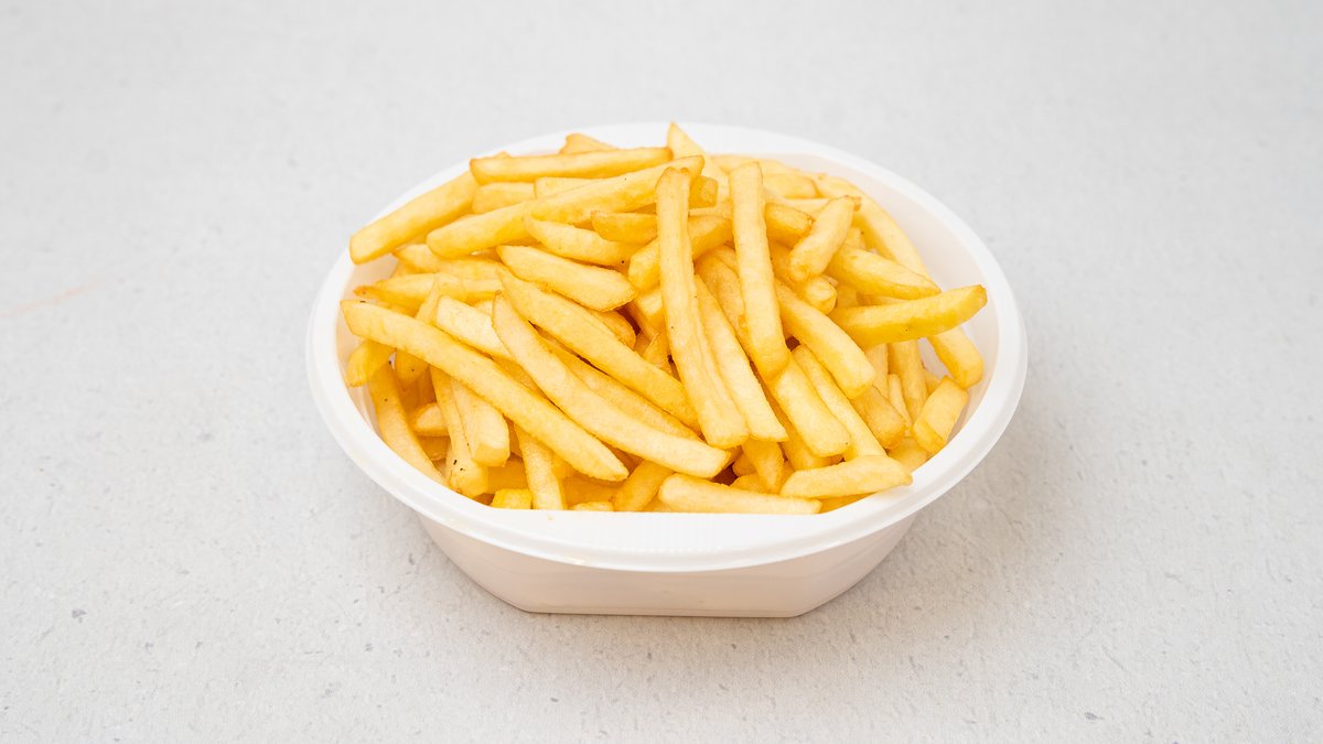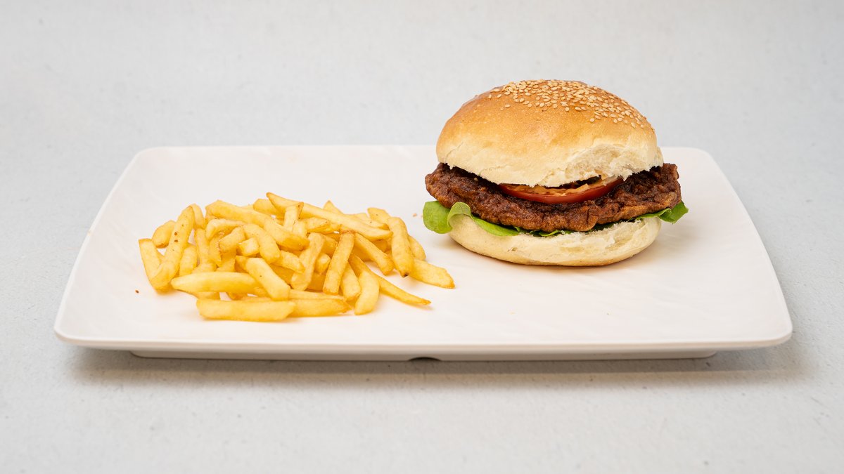 Mish i bluar, sos, majonezë, tranguj, domate, sallatë e gjelbër, pomfrit