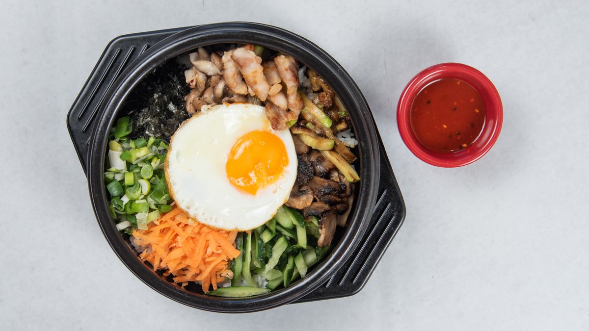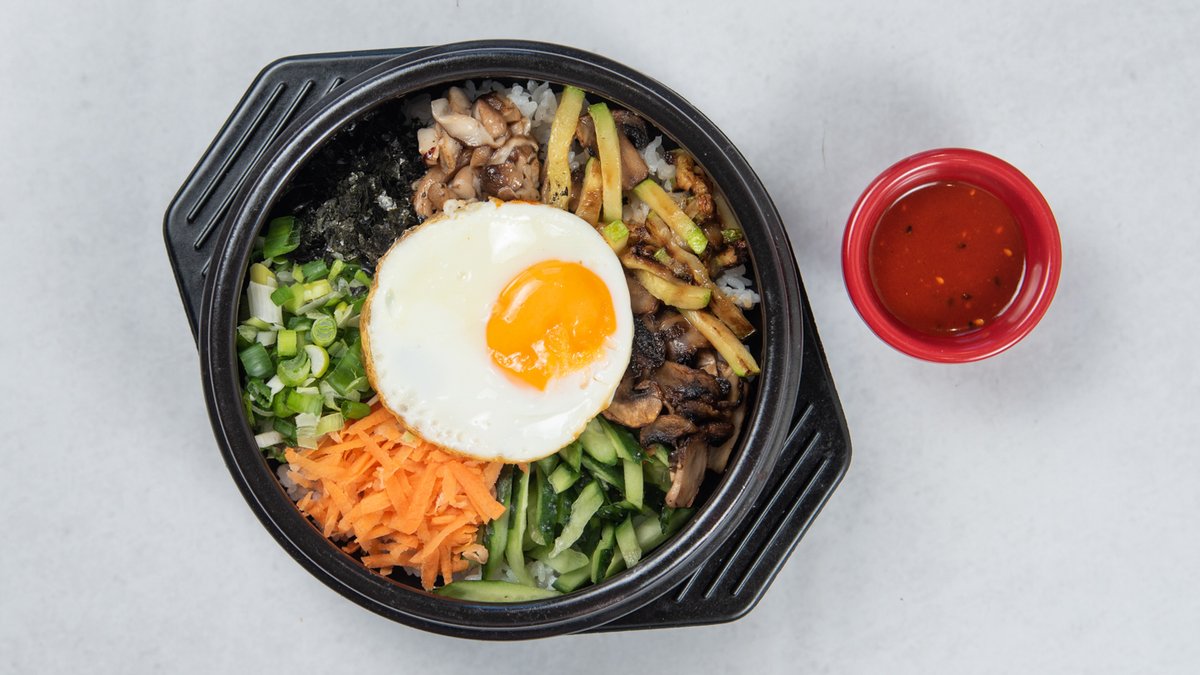 Bibimbap includes a variety of seasonal vegetables lightly stir fried or fresh and Chicken Thigh, all served on top of rice and garnished with a fried egg and Bibim sauce (add in the amount you want). Bibmbap is eaten mixed, like a salad, and is mixed by the consumer.