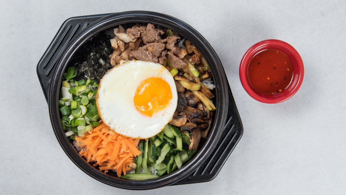 Bibimbap includes a variety of seasonal vegetables lightly stir fried or fresh and thinly sliced beef bulgogi, all served on top of rice and garnished with a fried egg and Bibim sauce (add in the amount you want). Bibmbap is eaten mixed, like a salad, and is mixed by the consumer.