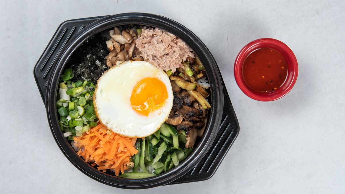 Bibimbap includes a variety of seasonal vegetables lightly stir fried or fresh and tuna mayo, all served on top of rice and garnished with a fried egg and Bibim sauce (add in the amount you want). Bibmbap is eaten mixed, like a salad, and is mixed by the consumer.