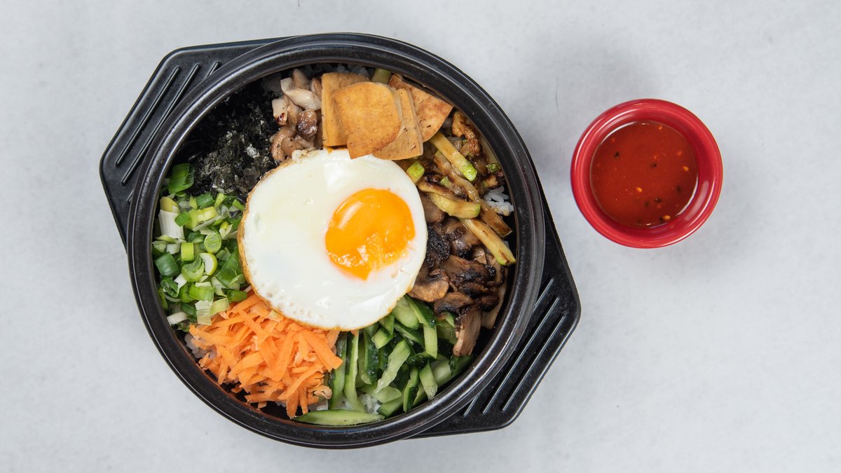 Bibimbap includes a variety of seasonal vegetables lightly stir fried or fresh and tofu, all served on top of rice and garnished with a fried egg and Bibim sauce (add in the amount you want). Bibmbap is eaten mixed, like a salad, and is mixed by the consumer.