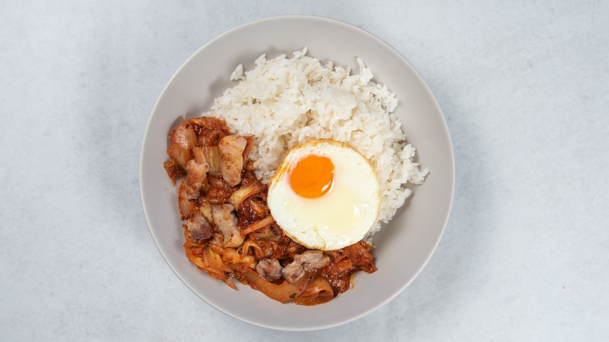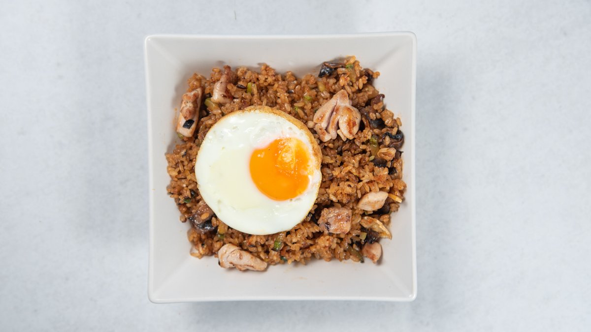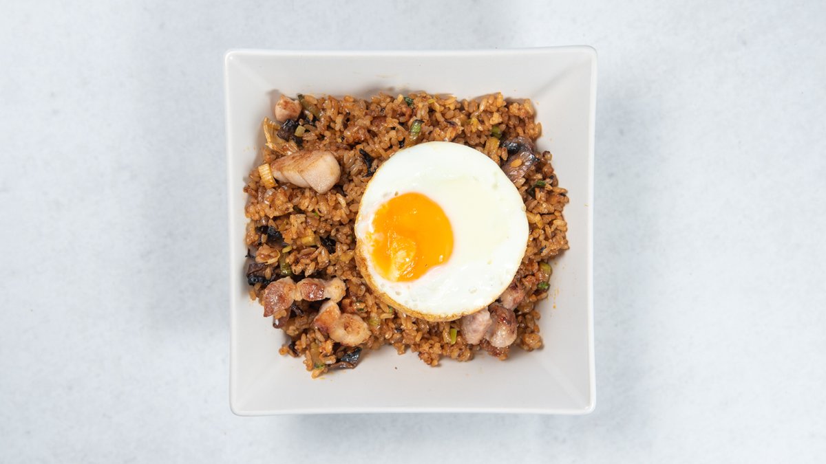 Pork fried rice is a simple rice dish stir-fried with Korean spices such as gochujang, sesame oil, soy sauce and seasonal veggies with pork belly, and it comes with a fried egg on top.