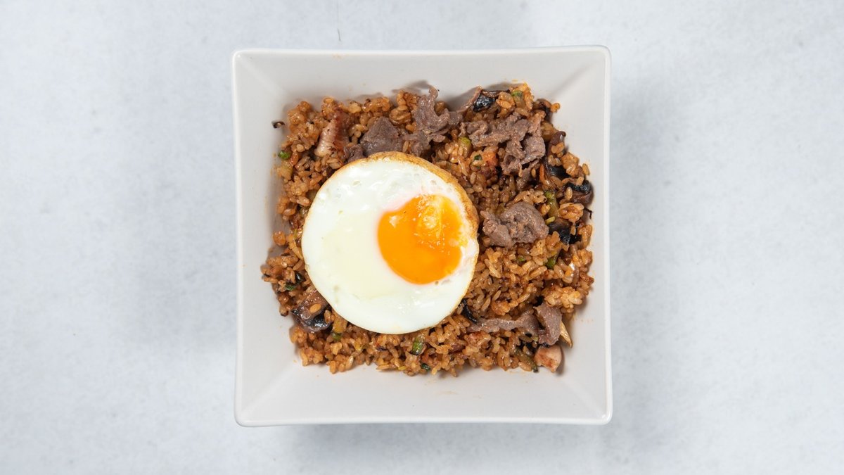 Beef fried rice is a simple rice dish stir-fried with Korean spices such as gochujang, sesame oil, soy sauce, seasonal veggies, beef and it comes with a fried egg on top.