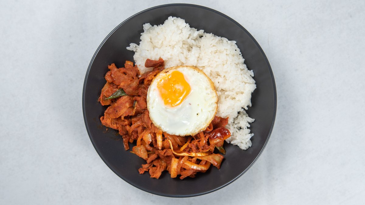 Topbap - Jaeyeuk is a popular Korean dish made with thinly sliced pork belly, marinated in soya sauce, garlic, and gochujang. Meat is stir fired with veggies and served with rice. This is the owners favorite dish on the menu!