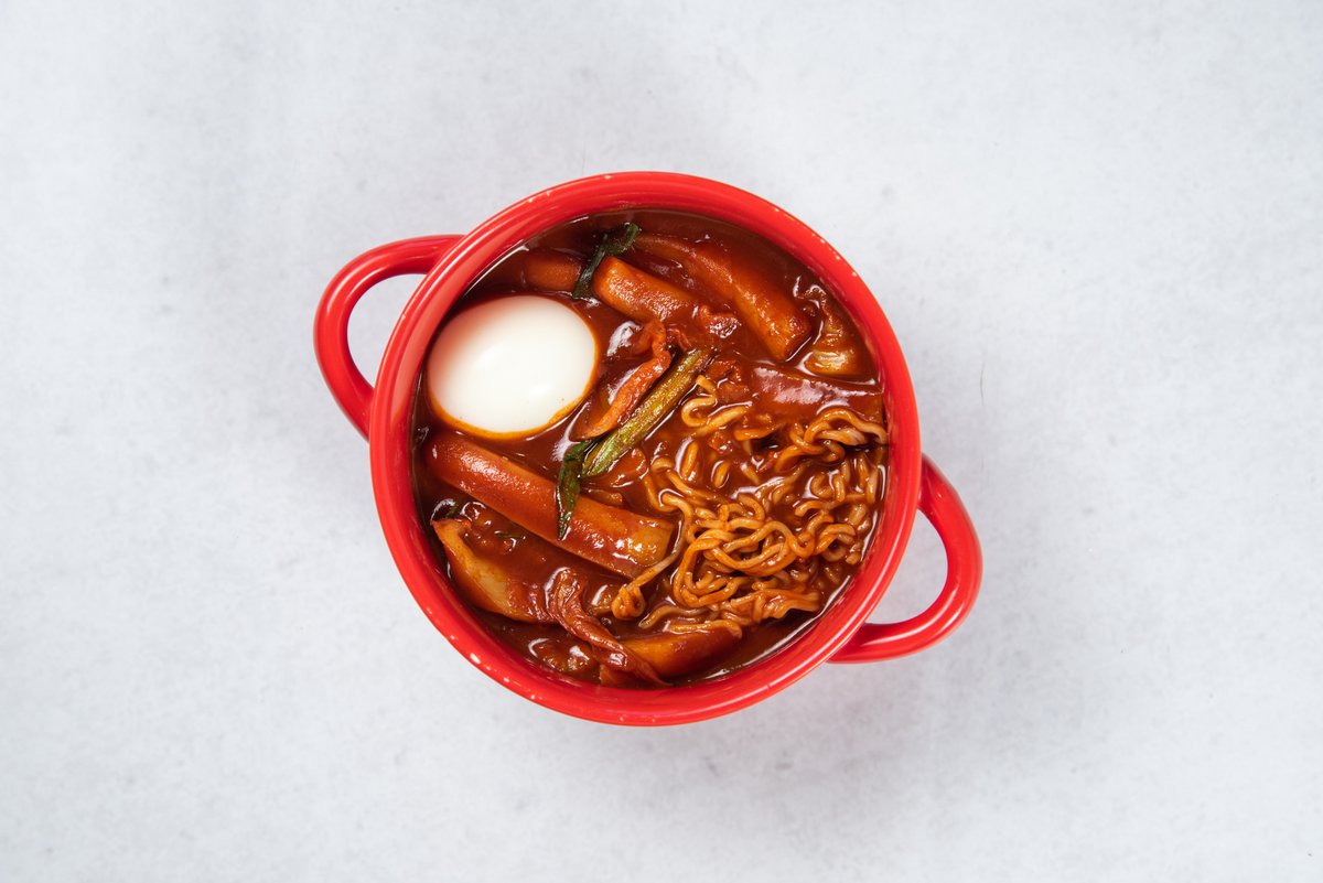Rabokki is a variation of tteokbokki, where the traditional rice cakes (tteok) are combined with instant ramen noodles, creating a spicy, savory dish often enjoyed as a comfort food in Korea + hard boiled egg.