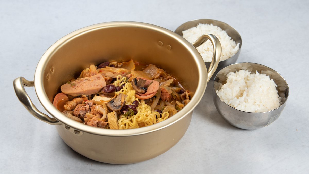 Popular Korean spicy army stew with ingredients that include ham, sausage, spam, baked beans, kimchi, instant noodles, gochujang, a lot of vegetables! This portion is made for two and comes with a side of two rice portions!