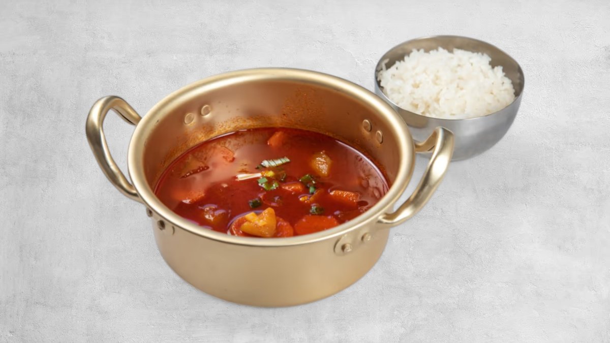 Savory and spicy chicken stew, with carrots and potatoes served with rice (200g). Korejski paprikaš.