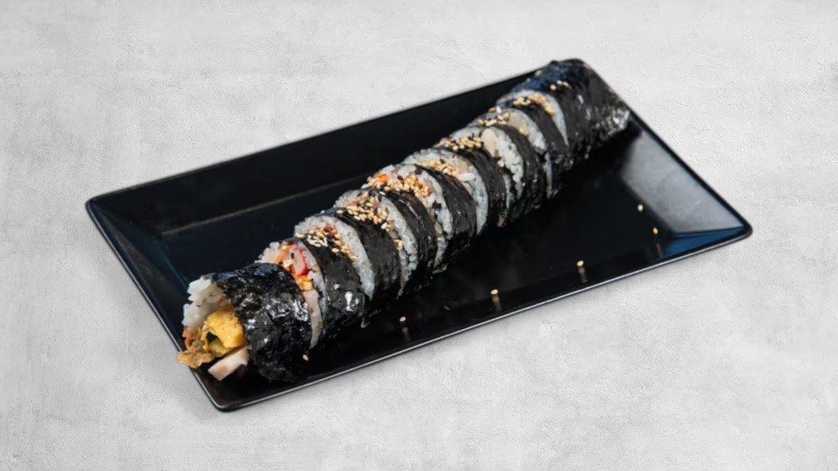 Kimbap is a Korean rice roll wrapped in seaweed and filled with vegetables, protein, and sesame oil-seasoned rice.