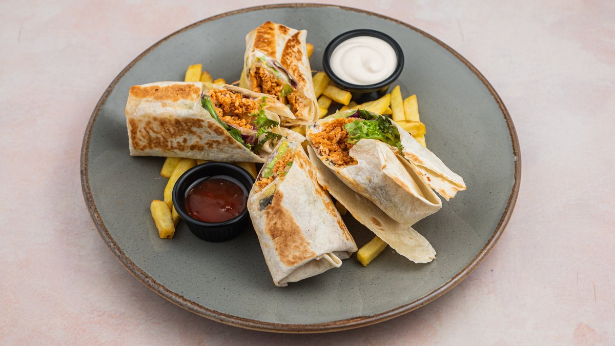 Tortilja, 3 jaja, čedar, pečenica, kačkavalj, grilovano povrće, pomfrit