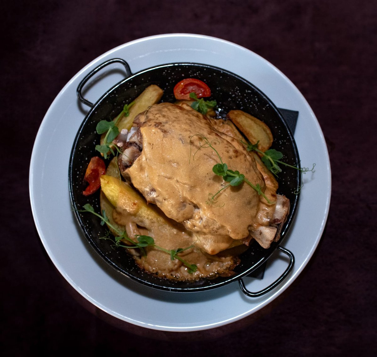 Na domaćem hlebu, šunka, kačkavalj, bešamel sos, senf sos, jaje na oko