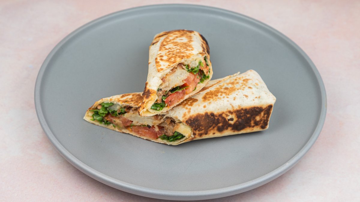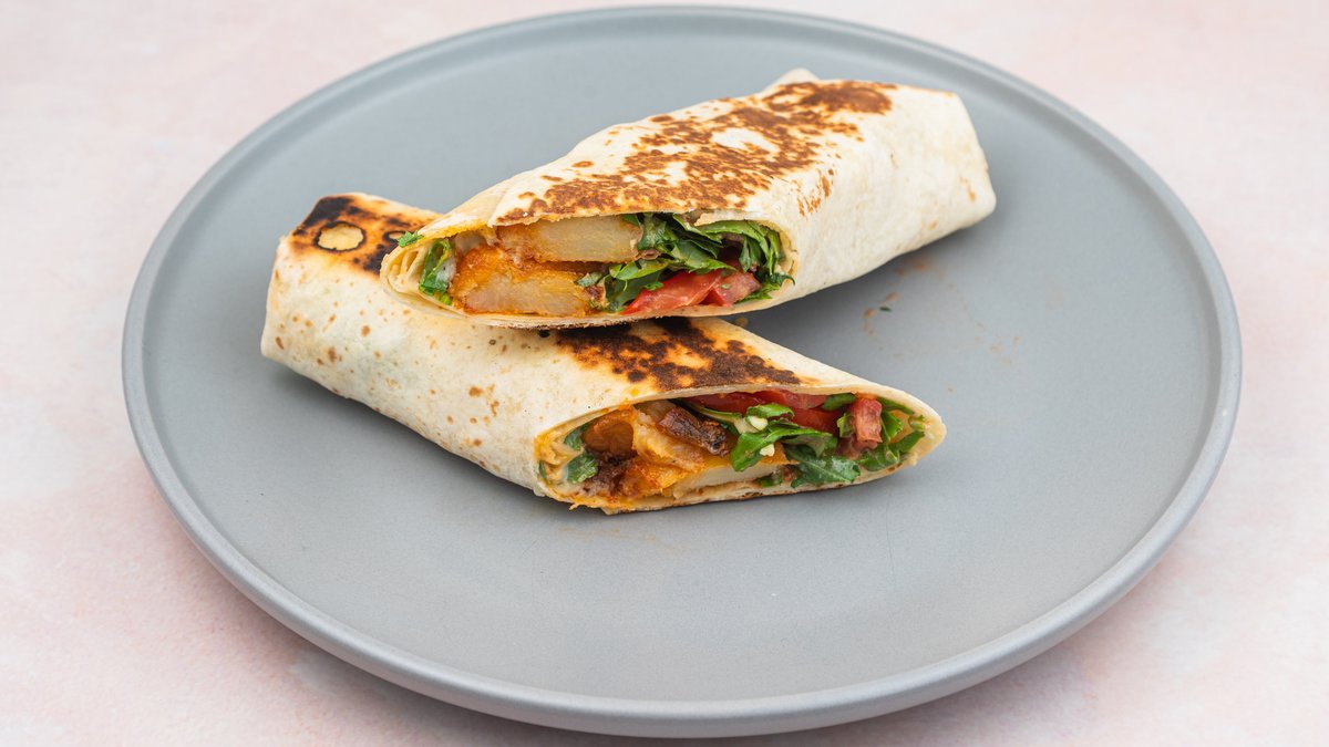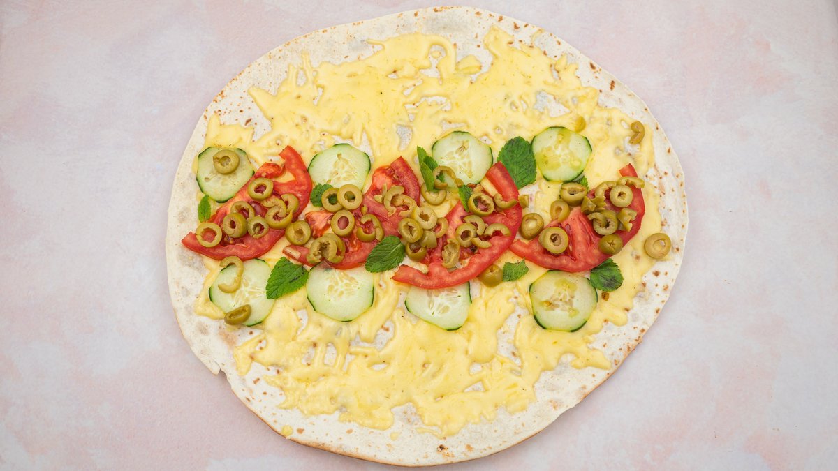 Vegan Shawarma, crveni luk sa persunom, paradajz, humus, kiseli krastavci, tahini sos