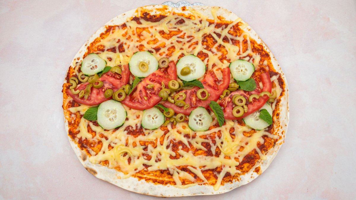 (zelena salata, paradajz, kiseli krastavci, crveni luk sa zacinima i persunom, humus, tahini sos)