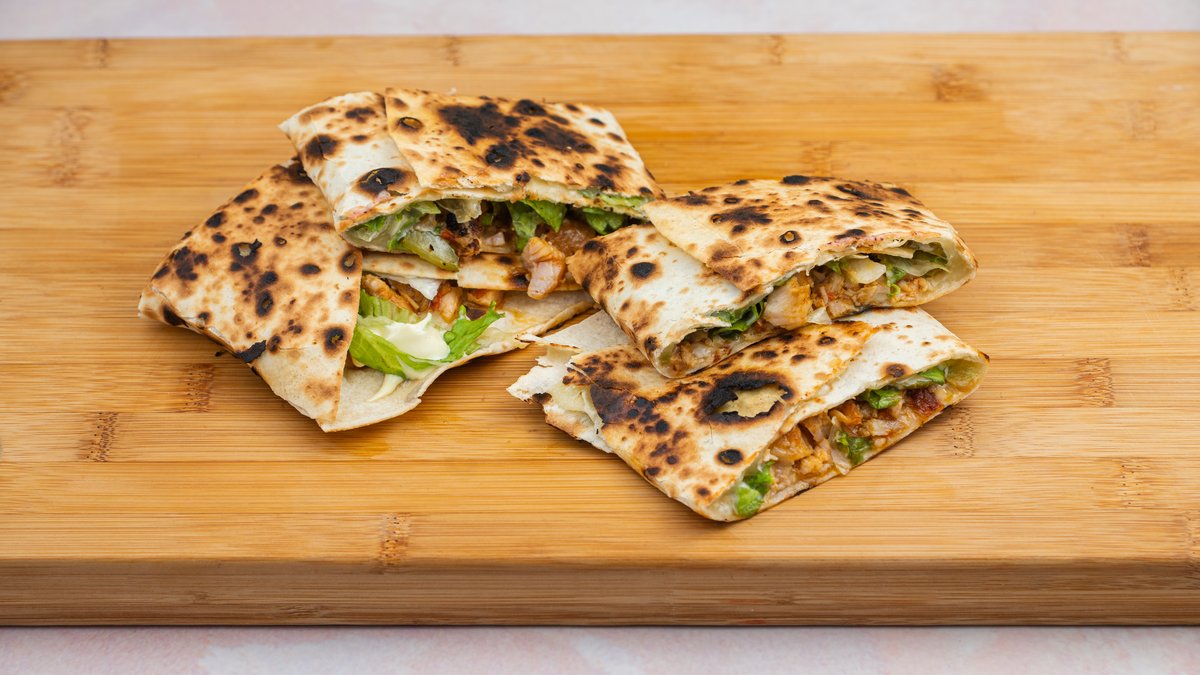 Marinirano pileće meso, zelena salata, paradajz, kiseli krastavaci, humus, beli luk sos,tahini sos