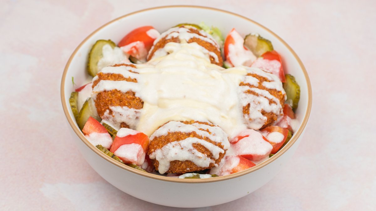 Falafel 200g, paradajz, zelena salata, kiseli krastavci, tahini sos, humus